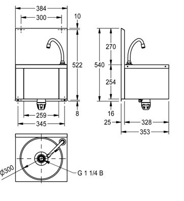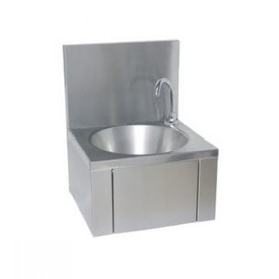 Wastafel van roestvrij staal, conische vorm met platte bodem, zelfsluitende kraan, activatie via frontpaneel, watertemperatuur via mengventiel in te stellen, inclusief waterafvoer en sifon, flexibele aansluiting. Inclusief spatrand en bevestigingsmateriaal. Afmetingen 384 x 540 x 353 mm (B x H x D)