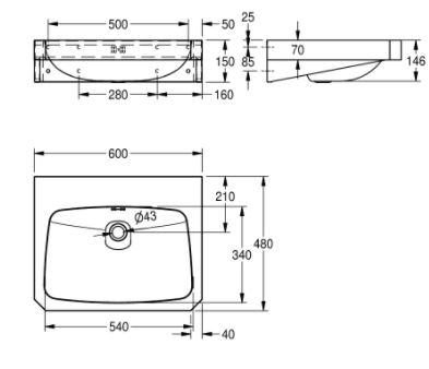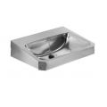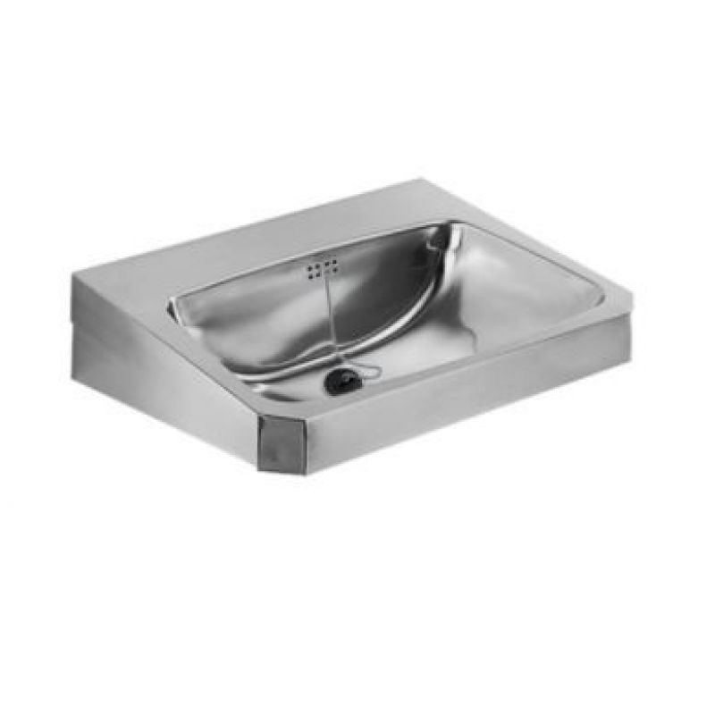 ANIMA WT600C Wastafel voor wandmontage, roestvrij staal, oppervlak zijdemat, materiaaldikte 1 mm, naadloos ingelaste waskom met afmetingen 550 x 350 x 145 mm, rechthoekig, kraanvlak 90 mm, met overloop, afvoer- en overloopgarnituur G 1 1/4 B afvoerplug, afvoer achteraan in het midden, frontpaneel met 45° hoeken, met ingelaste montagesteunen, bevestiging conform EN 31, inclusief schroeven en pluggen. Afmetingen 600 x 150 x 480 mm (B x H x D)