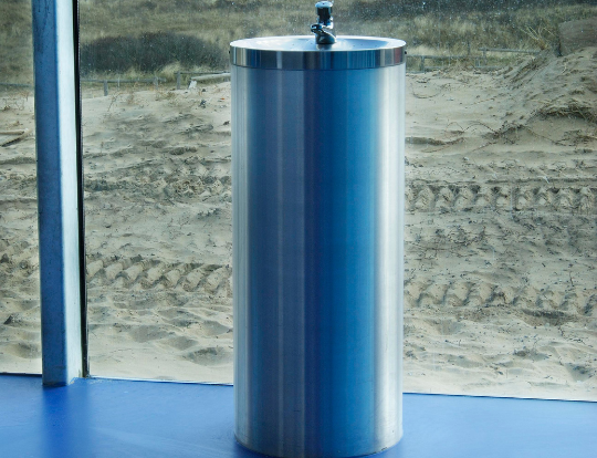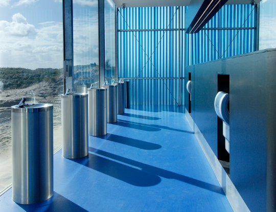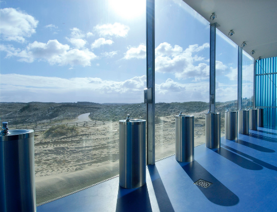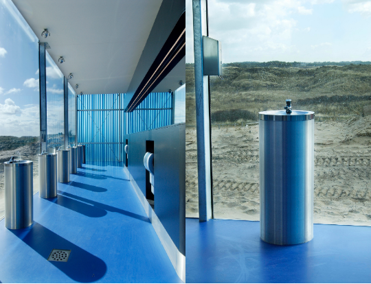 De bijzondere wastafels zijn zo geplaatst, dat men bij het handen wassen een schitterend uitzicht op de zee heeft. Zo wordt het moderne materiaal RVS een onderdeel van de prachtige natuurlijke omgeving.