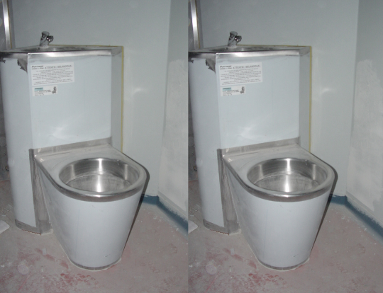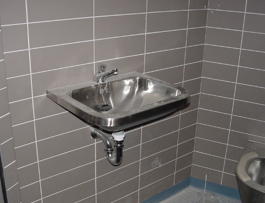 Om er zeker van te zijn dat de arrestanten de units niet kunnen vernielen, zijn de toilet-wastafelcombinaties op locatie door de aannemer volgestort met beton.