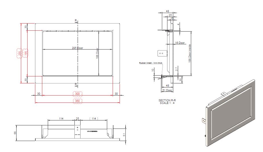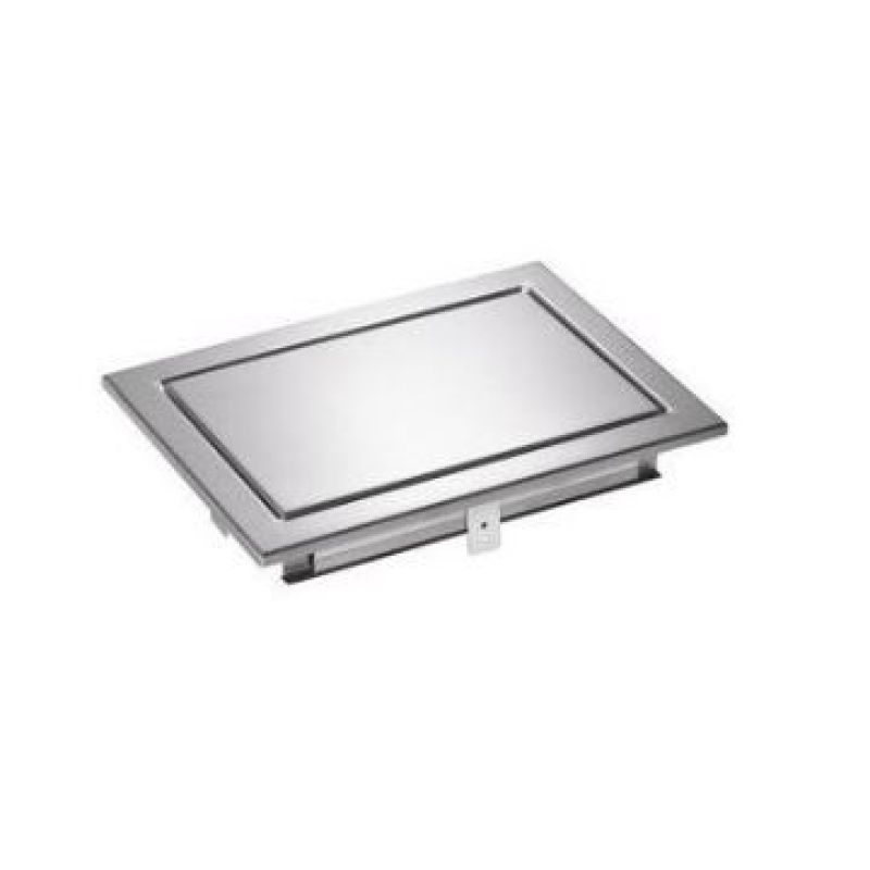 RVS doorvoer tbv afval/handdoekjes. Montage in wand of deur. Uitw. afm. 360x255mm, klep inw. 295x190mm. (met klem/veer)