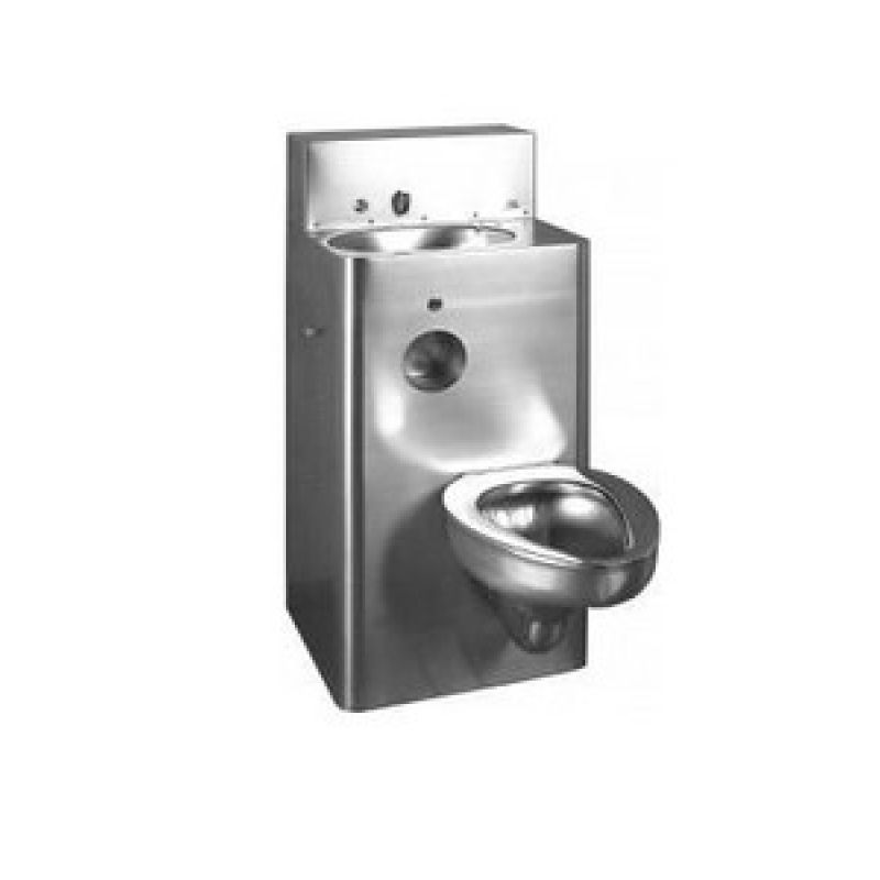 Wastafel (ovaal) en toilet in één met geïntegreerd Geberit spoelreservoir (960610). Wasbak voorzien van geprofileerd zeepbakje en ingeperst gaatjesrooster; incl. WC-papierhouder. De spoelrand is zo ontworpen dat het verwonden van de gebruiker en het verbergen van voorwerpen bij na uitgesloten zijn. Met ergonomisch gevormde toiletzitting; Positionering toilet kan links, rechts, frontaal links en frontaal rechts. Staande of hangende uitvoering mogelijk. Centaal toilet 510x920x1200mm, zijdelings toilet 737x603x1200mm.