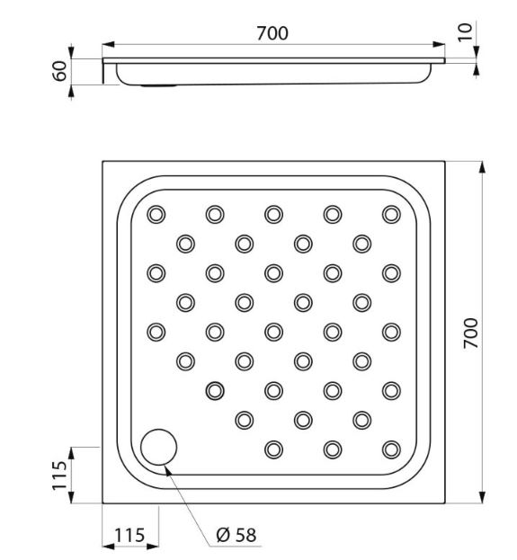 In te bouwen douchetub, 700x700mm. Bacteriostatisch RVS 304. Gesatineerde afwerking. Dikte RVS: 1,2 mm. Geperste douchebak, zonder lasnaden, voor een eenvoudig onderhoud en een betere hygiëne. De binnenranden zijn afgerond voor een betere veiligheid in de douche. Hellend vlak. Geleverd met afvoer 1"1/2. Antislip bodem. CE keurmerk. Conform de norm EN 14527. Gewicht: 5,5 kg.