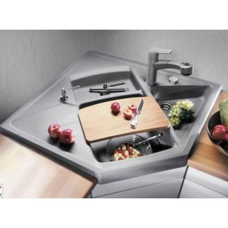 Parelgrijs spoelbak voor opbouw hoekmodule uitw. 900-900x615x390mm. Incl. korfplug/w.o. Grote en diepe hoofdspoelbak om groter kookgerei gemakkelijk af te wassen. Zeer ruim restbakje om groenten en fruit te spoelen. Innovatief opbergbakje achter de hoofdspoelbak. Wat u op de verschuifbare snijplank voorbereidt, schuift u zonder omwegen in potten en schalen. Snijplank uit beukenhout, BLANCO TORRE afwasmiddeldispenser, plaatsbesparend afloopgarnituur, korfventiel 3 ½'' met draaiknopbediening en twee 1 ½'' korfventielen.
