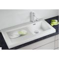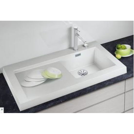 Wit spoelbak met afdruip voor opbouw uitw. 1200-605mm. Incl. korfplug/w.o. Hoge standaard qua esthetiek en architectuur. Elegante kubusvorm. Pragnante rand rondom met brede kraanrichel. Grote bak met verdekte overloop C-overflow® en afloopbedekking CapFlow. Het in 2 richtingen aflopende verlek biedt veel werkruimte aan. Unieke snijplank in hoogwaardige en innovatieve materialen. Kan op verschillende manieren ingebouwd worden. Snijplank in essenhout-compound, plaatsbesparend afloopgarnituur, InFino® korfventiel 3 ½'' met draaiknopbediening.