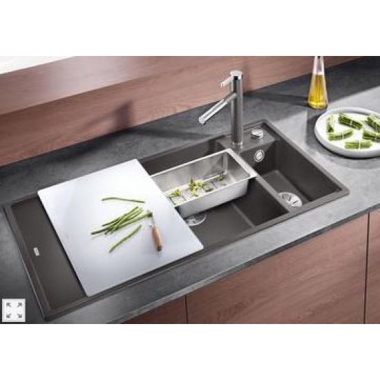 BLANCOAXIA-III6S Alumetallic spoelbak met afdruip voor opbouw uitw. 1000-510mm. Incl. korfplug/w.o. Vlotte, ergonomische workflow langs twee assen. Design gekenmerkt door strakke lijnen en een dunne, ultravlakke boord. Zeer kleine hoekradii voor een optimale benutting van oppervlakten en volumes. Het multifunctionele vergiet kan ook vrij in de hoofdbak geplaatst worden om de voedselbereiding te vergemakkelijken. Hoogwaardige afwerking met verdekte C-overflow® overloop en InFino® afloopsysteem – elegant geïntegreerd en uiterst onderhoudsvriendelijk. Ook beschikbaar in versie voor vlakbouwmontage. Snijplank in veiligheidsglas, multifunctioneel inzetbakje in rvs, plaatsbesparend afloopgarnituur, InFino® korfventielen 3 ½'' met draaiknopbediening op de hoofdbak.
