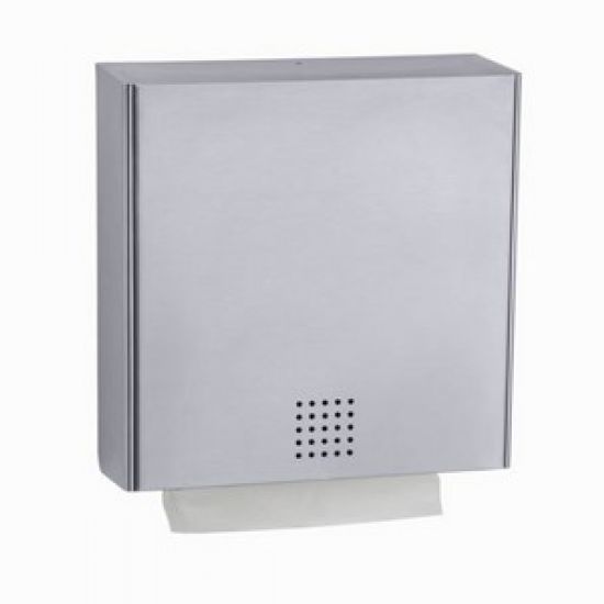 RVS dispenser voor papieren handdoekjes. Afmeting 300x322,5x125,5 mm. Front is van 1,5mm materiaaldikte. Geschikt voor ca. 550 stuks Z-gevouwen handdoekjes.