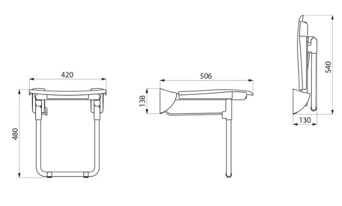 Excl. rugsteun (apart verkrijgbaar). Afm. zitting 420x506 (incl. wandbevestiging). Opklapbaar douchezitje met vloersteun, voor muurmontage. Slijtvaste zitting extra comfort. Breed model. Blijft in verticale stand staan. Afgeremde op- en neerwaartse beweging. Volle en losklikbare zitting vervaardigd uit polymeer met hoge weerstand. Geschikt voor intensief gebruik in utiliteiten en ziekenhuizen. Gelijkmatig en poriënvrij oppervlak, onderhoudsvriendelijk en hygiënisch. Goed bestand tegen chemische producten en reinigingsmiddelen. UV-bestendig. Aangenaam en warm om aan te raken. Structuur in RVS buis Ø 32, bacteriostatisch RVS 304. Gesatineerde UltraSatin afwerking. Versterkt met een steunvoet met RVS 304 plooimechanisme Ø 25 x 1,2 mm. 6 bevestigingspunten. Geleverd met RVS schroeven voor bevestiging in beton. Getest op meer dan 300 kg. Maximale toelaatbare belasting: 170 kg. Plaats inname in opgeklapte toestand: 130 x 540 mm. Afmetingen: 506 x 420 x 480 mm. 10 jaar garantie. CE gekeurd.