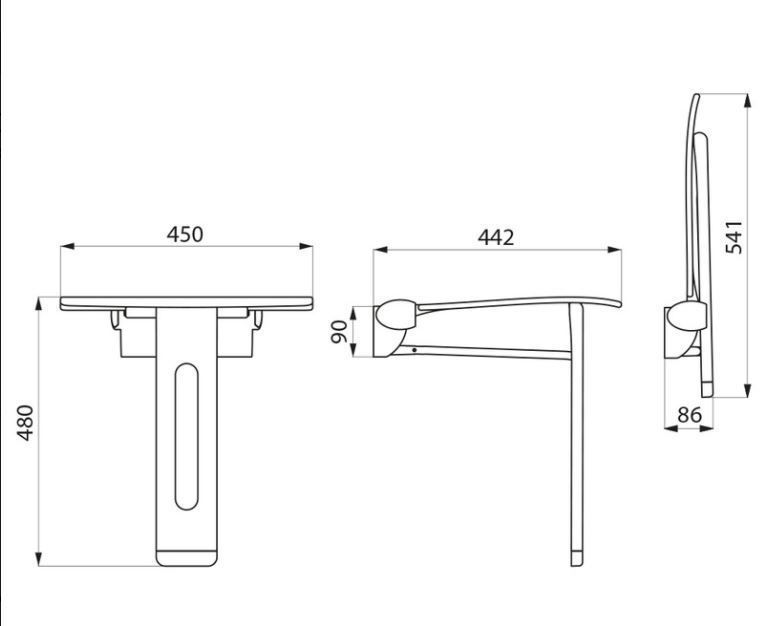 Afneembaar opklaapbaar Be-Line douchezitje voor mindervaliden. Breed model. Blijft in verticale stand staan. Afgeremde op-en neerwaartse beweging. Afneembaar: eenvoudig demonteerbaar met antidiefstal veiligheid. Beperkt het aantal zitjes in een instelling en biedt de mogelijkheid enkel een zitje te plaatsen wanneer nodig. Voorbeeld: hotel of ziekenhuisdattijdelijkeenmindervalidepersoonherbergt. Volle zitting vervaardigd uit polymeer met hoge weerstand. Geschikt voor intensief gebruik in utiliteiten en ziekenhuizen. Antislip oppervlak. Verstevigd met een centrale scharnierende voet. Witte uitvoering wat visueel contrast met de muur mogelijk maakt. Bevestigingsplaat in massief aluminium. 5 onzichtbare bevestigingspunten. Geleverd met rvs schroeven Ø 8 x 70 mm voor bevestiging in beton. Getest op meer dan 200 kg. Maximale toelaatbare belasting: 135 kg. Plaats inname in opgeklapte toestand: 86 x 541 mm. Afmetingen: 442 x 450 x 480 mm mm. 10 jaar garantie. CE markering.