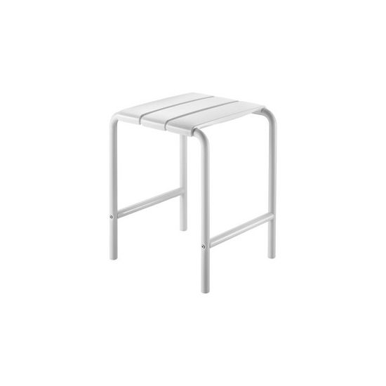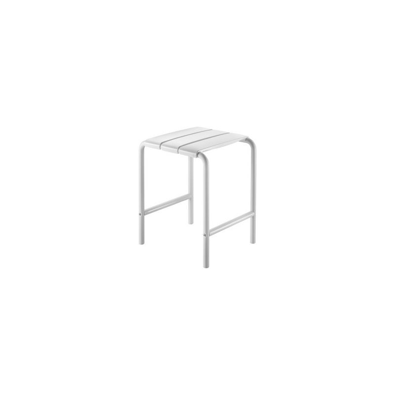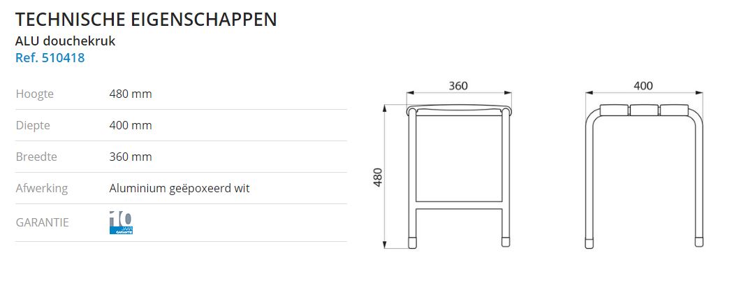 ALUdouchekruk voor mindervaliden. Buisstructuur in wit aluminium Ø 25 x 2 mm. Kunststof beschermingskapjes. Brede comfortabele kunststof steunlatten, gemakkelijk in onderhoud. Zithoogte: 480 mm. Getest op meer dan 200 kg. Aanbevolen maximale toelaatbare belasting: 135 kg. Afmetingen: 400 x 360 x 480 mm.