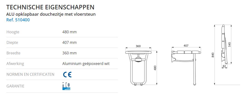 510400 ALU opklapbaar douchezitje met vloersteun geëpoxeerd wit aluminium