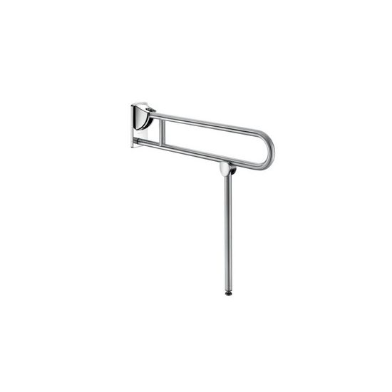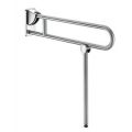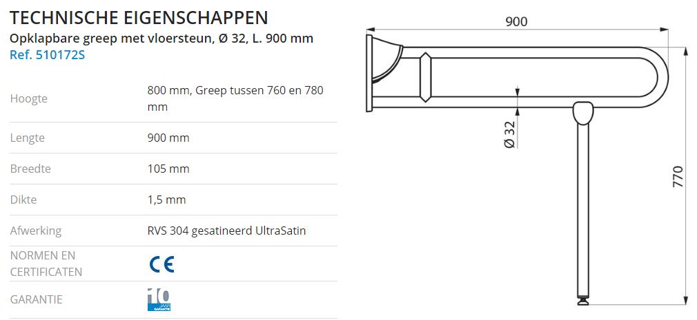 Opklapbare greep Ø 32 met vloersteun voor mindervaliden. In neergeklapte positie kan de steun dienen als hulpmiddel bij het verplaatsen van een persoon in WC of douche. In verticale positie is zijwaartse toegang mogelijk. Met vloersteun die zich automatisch opvouwt, voor extra stevigheid wanneer muurbevestiging alleen niet volstaat. De hoogte van de vloersteun is regelbaar tussen 760 en 780 mm. Afmetingen: 850 x 800 x 105 mm, Ø 32. Dikte van de buis: 1,5 mm. Afgeremde op- en neerwaartse beweging. Blijft in verticale positie staan. Buis in bacteriostatisch RVS 304. Mat gepolijste UltraSatin afwerking, homogeen en poriënvrij oppervlak voor een maximale hygiëne en gemakkelijk onderhoud. Verborgen bevestigingen, bevestigingsplaat in RVS 304 van 4 mm dik. Geleverd met RVS schroeven voor bevestiging in beton. Getest op meer dan 200 kg. Maximale toelaatbare belasting: 135 kg.