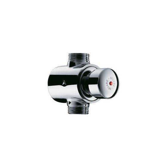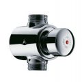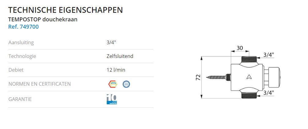 Zelfsluitende douchekraan voor opbouw: Zelfsluitende kraan TEMPOSTOP M3/4" voor toevoer in lijn van gemengd water. Zelfsluiting na ~30 sec. Debiet 12 l/min bij 3 bar met debietregeling. Lichaam en drukknop in massief messing verchroomd.