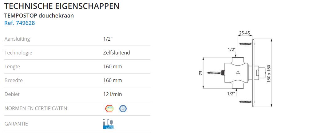 Zelfsluitende douchekraan voor inbouw: Regelbare inbouwdiepte tussen 25 en 45 mm. Afdekplaat in RVS gesatineerd 160 x 160 mm. Zelfsluitende kraan TEMPOSTOP F1/2" voor toevoer van gemengd water. Zelfsluiting na ~30 sec. Debiet 12 l/min bij 3 bar, aanpasbaar. Lichaam en drukknop in massief messing.