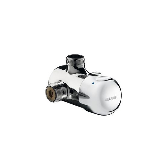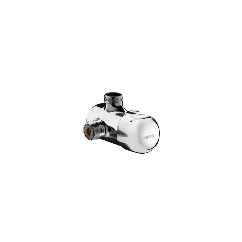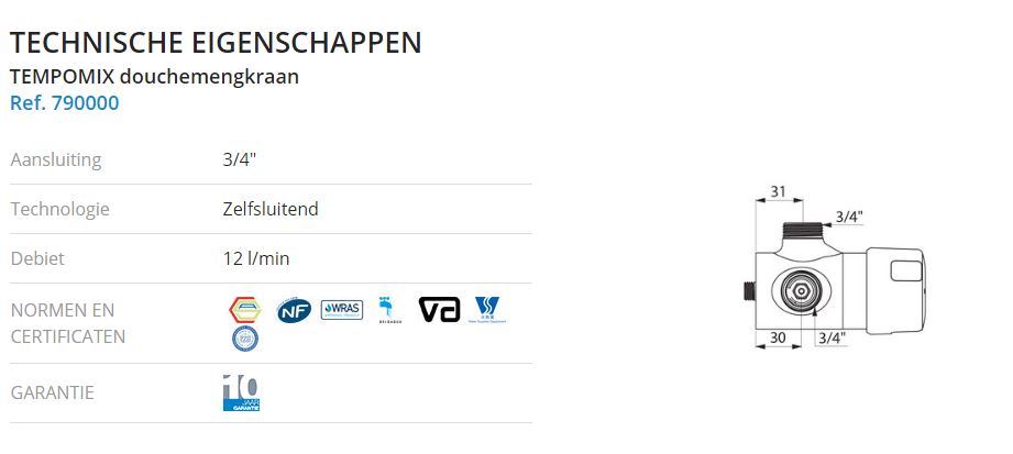 Zelfsluitende douchemengkraan voor installatie in opbouw: TEMPOMIX ééngreepsmengkraan 3/4". Temperatuurregeling en bediening op de drukknop. Temperatuurbegrenzing (regelbaar door de installateur). Soepele bediening. Zelfsluiting na ~30 sec. Debiet 12 l/min bij 3 bar, aanpasbaar. Massief messing verchroomd. Terugslagkleppen en filters geïntegreerd. Greep in Bayblend® verchroomd. Aansluiting in lijn, asafstand 90 mm.