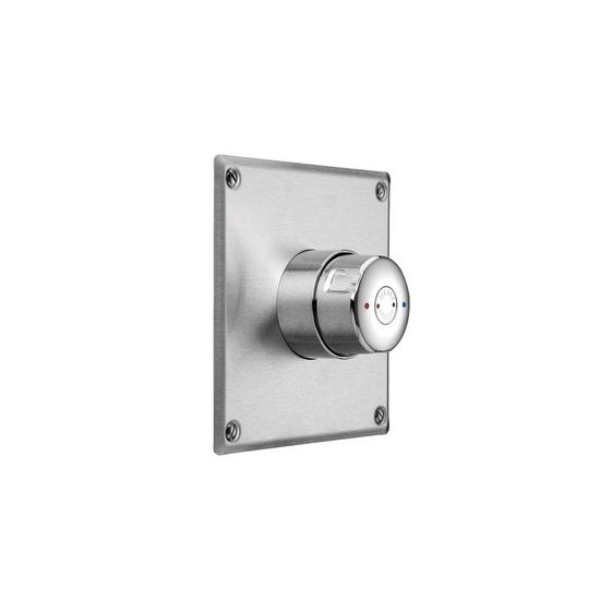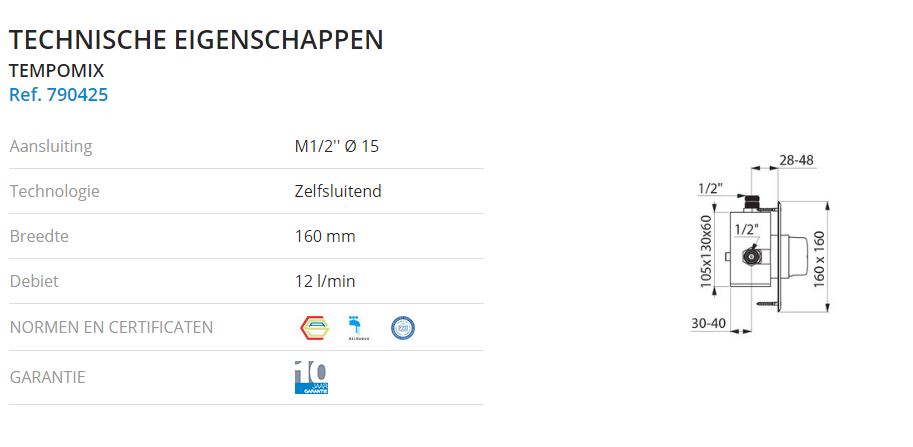 Zelfsluitende douchemengkraan voor inbouw: Standaard inbouwkast. RVS afdekplaat 160 x 160. Regelbare inbouwdiepte tussen 28 en 43 mm. TEMPOMIX ééngreepsmengkraan 3/4"achter rozet. Strakke vormgeving. Temperatuurregeling en bediening op de drukknop. Temperatuurbegrenzing (regelbaar door de installateur). Zelfsluiting na ~ 30 sec, soepele bediening. Debiet 12 l/min bij 3 bar. Aansluitingen M1/2" voor koperen buis Ø 15. Terugslagklep en filters geïntegreerd. Greep in Bayblend® verchroomd.
