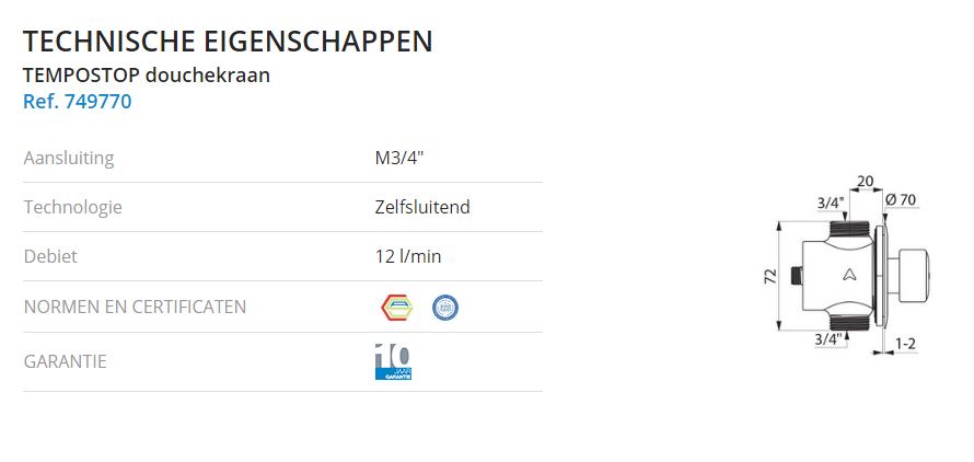 Zelfsluitende douchekraan voor paneel: Voor montage op paneel 2 mm max. Zelfsluitende kraan TEMPOSTOP M3/4" voor toevoer van gemengd water. Zelfsluiting na ~30 sec. Debiet 12 l/min bij 3 bar, aanpasbaar. Lichaam en drukknop in massief messing. Aanspanring achteraan. 10 jaar garantie.