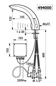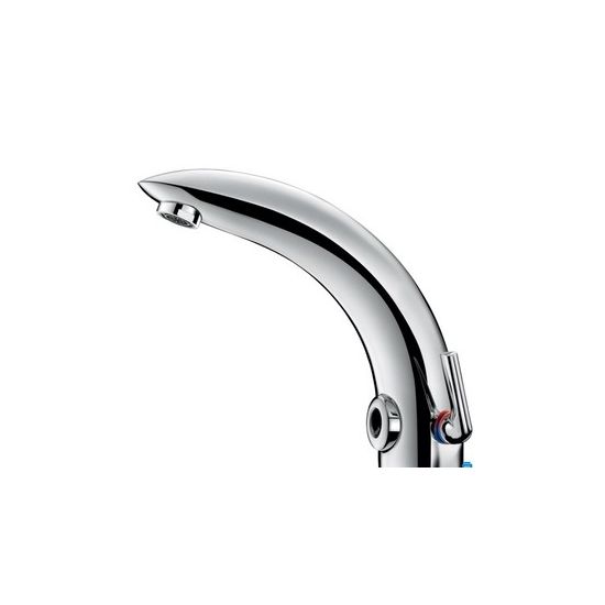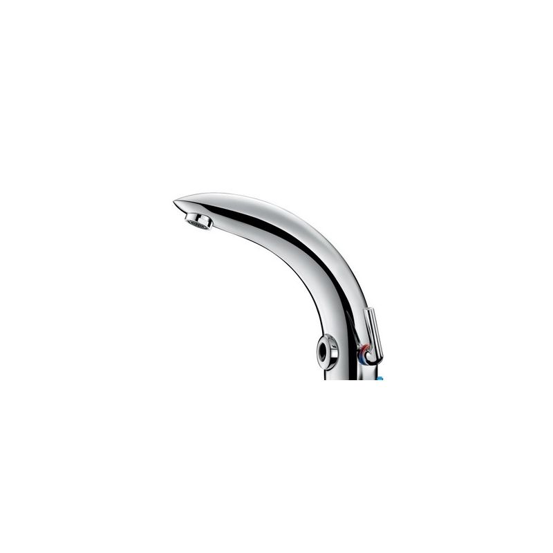 Elektronische wastafelmengkraan op blad: Individuele elektrische sturing IP65. Stroomtoevoer via netspanning met transfo 230/12 V. Debiet ingesteld op 3 l/min bij 3 bar, aanpasbaar tussen 1,5 en 6 l/min. Kalkwerende straalbreker. Configureerbare periodieke spoeling (ingesteld op ~60 sec elke 24 h na laatste gebruik). Schokbestendige aanwezigheidsdetectie met infrarood technologie. Lichaam in massief messing verchroomd. PEX slangen met filters en elektroventiel M3/8". Verstevigde bevestigingen. Anti-blokkeerveiligheid in stromende toestand. Temperatuurregeling op de zijkant met standaard mengsleutel, met regelbare temperatuurbegrenzing. 10 jaar garantie.