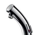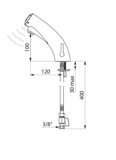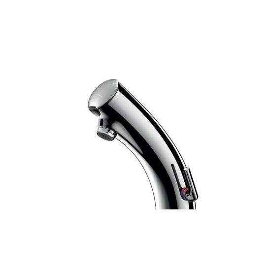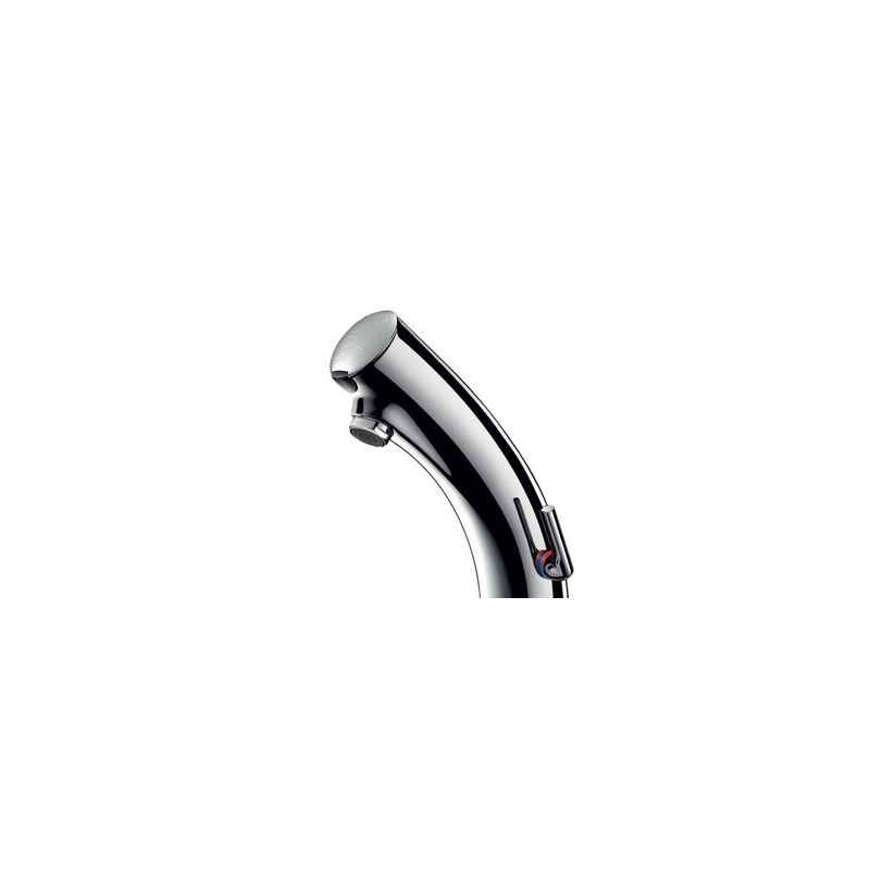 Elektronische wastafelmengkraan op blad: Stroomtoevoer via 223 Lithium 6 V batterij geïntegreerd. Antistagnatie elektroventiel en elektronische module geïntegreerd in het kraanlichaam. Debiet ingesteld op 3 l/min bij 3 bar, aanpasbaar tussen 1,5 en 6 l/min. Kalkwerende straalbreker. Periodieke spoeling (~60 sec elke 24 h na laatste gebruik). Aanwezigheidsdetectie met actieve infrarood technologie, geoptimaliseerd aan het uiteinde van de uitloop. Lichaam in massief messing verchroomd. Afdekkapje vergrendeld met 2 verborgen schroeven, met pictogram waardoor onmiddellijke identificatie mogelijk is. PEX slangen F3/8" met stopkraantjes, filters en terugslagkleppen. Verstevigde bevestigingen. Anti-blokkeerveiligheid in stromende toestand. Temperatuurregeling op de zijkant met standaard mengsleutel, met regelbare temperatuurbegrenzing.