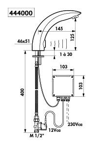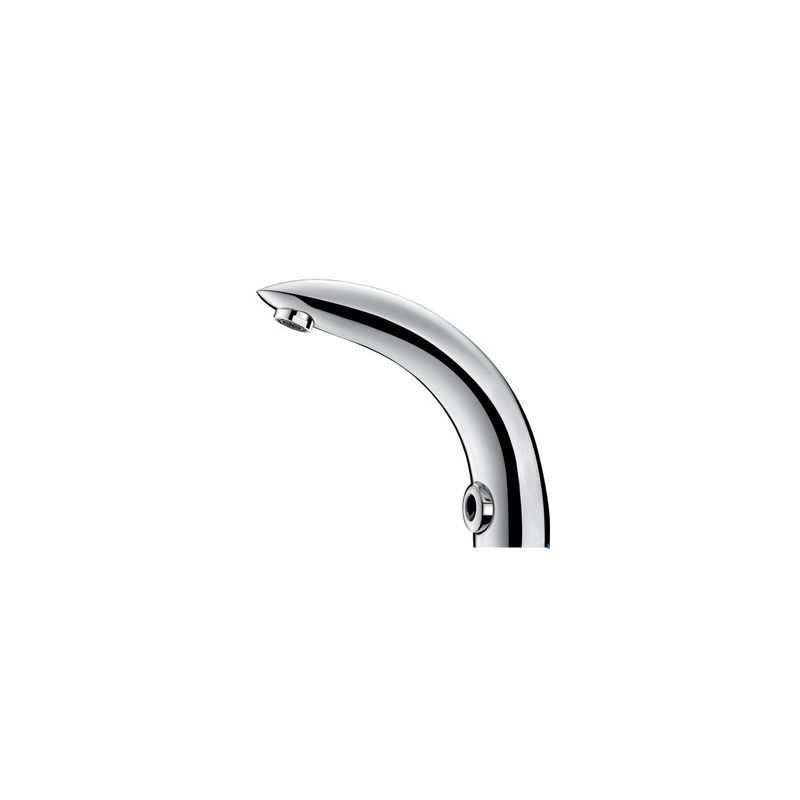 Elektronische wastafelkraan op blad: Individuele elektrische sturing IP65. Stroomtoevoer via netspanning met transfo 230/12 V. Debiet ingesteld op 3 l/min bij 3 bar, aanpasbaar tussen 1,5 en 6 l/min. Kalkwerende straalbreker. Configureerbare periodieke spoeling (ingesteld op ~60 sec elke 24 h na laatste gebruik). Schokbestendige aanwezigheidsdetectie met infrarood technologie. Lichaam in massief messing verchroomd. PEX slang met filter en elektroventiel M3/8". Verstevigde bevestigingen. Anti-blokkeerveiligheid in stromende toestand.