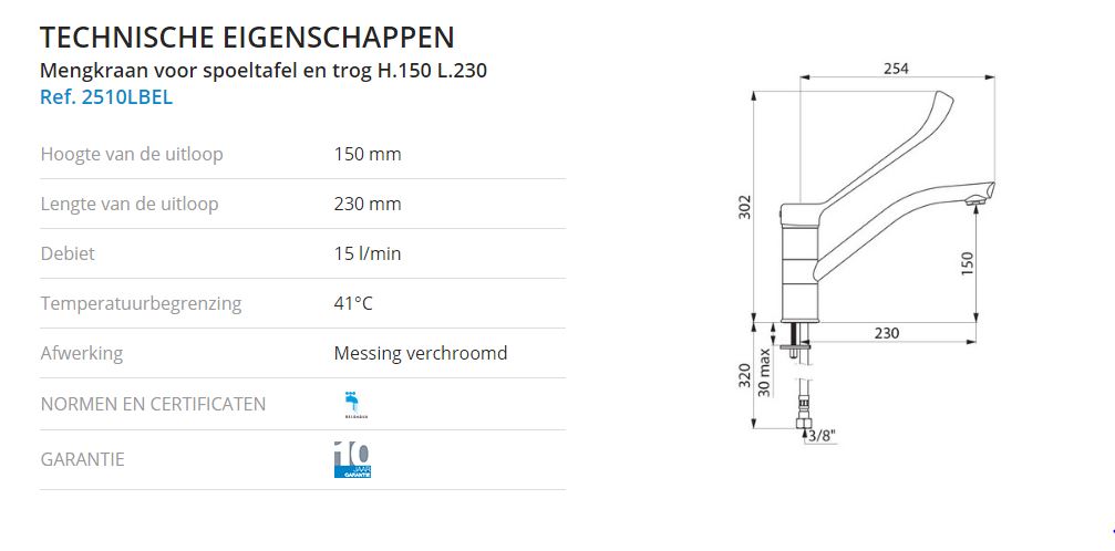 Mechanische mengkraan voor spoeltafel en trog met draaibare uitloop H.150. Uitloop H.150 L.230 met hygiënische straalbreker. Keramisch binnenwerk Ø 40.Met vooraf ingestelde temperatuurbegrenzing. Debiet 15 l/min bij 3 bar. Lichaam en uitloop met gladde binnenkant. Hygiënische hendel L. 200. Verstevigde bevestiging. Terugslagklep en filter op de koud water toevoer. Met PEX slangen F3/8".