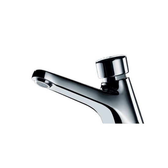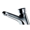 Zelfsluitende kraan voor wastafel op blad: Zelfsluiting na ~7 sec. Debiet ingesteld op 3 l/min bij 3 bar, aanpasbaar tussen 1,5 en 6 l/min. Vandaalbestendige, kalkwerende straalbreker. Lichaam in massief messing verchroomd M1/2". Bevestiging met contramoer.