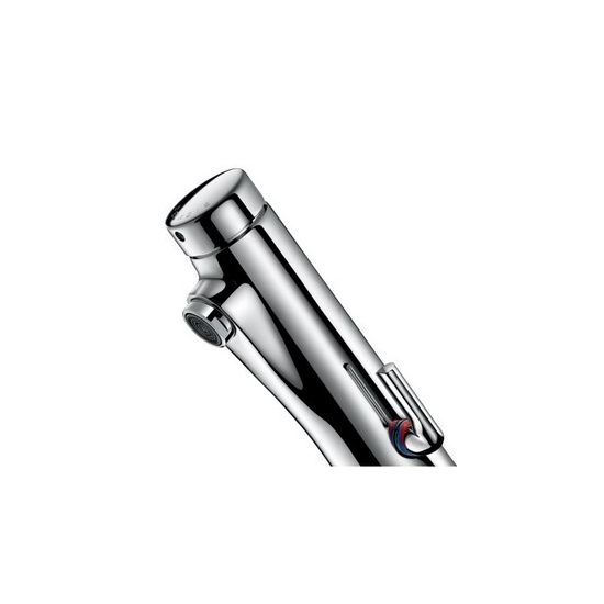 Temposoft zelfsluitende wastafelkraan warm/koud 3/8" Zelfsluitende mengkraan voor wastafel op blad: Soepele bediening. Zelfsluiting na ~7 sec. Debiet ingesteld op 3 l/min bij 3 bar, aanpasbaar tussen 1,5 en 6 l/min. Kalkwerende beluchter. Lichaam in massief messing verchroomd. PEX flexibels F3/8" met stopkranen, filters en terugslagkleppen. Verstevigde bevestigingen. Temperatuurregeling op de zijkant met standaard mengsleutel, met regelbare temperatuurbegrenzing. 10 jaar garantie.