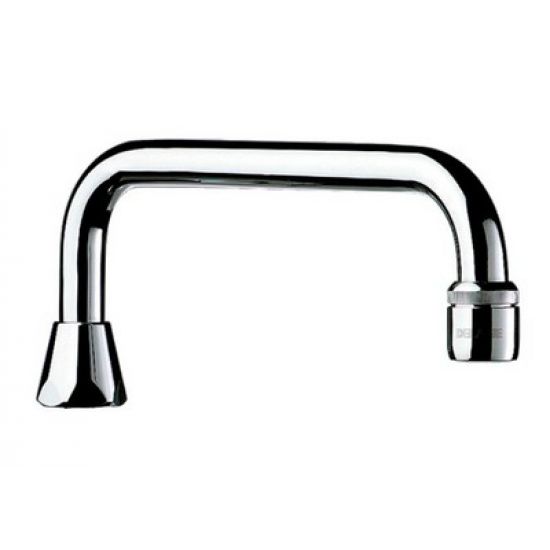 Draaibare uitloop op blad. Massief messing verchroomd. Straalbreker ingesteld op 3 l/min. F1/2", L. 200 mm, H.65 mm.