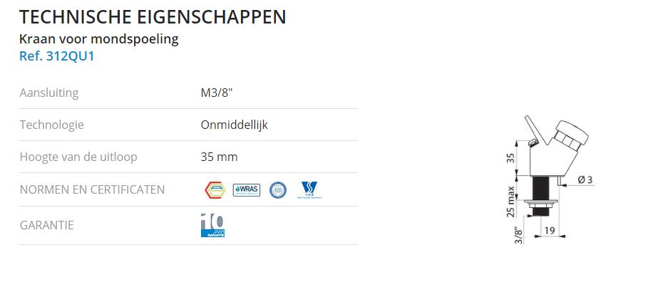 Kraan voor mondspoeling voor waterfontein: Onmiddellijke sluiting. Regelbaar debiet. Messing verchroomd. Aansluiting M3/8". Bij 3 bar geeft de kraan een max debiet van 3,7 lt/min