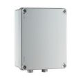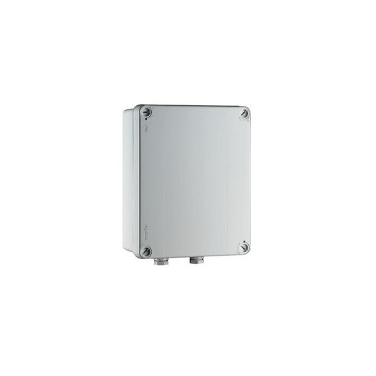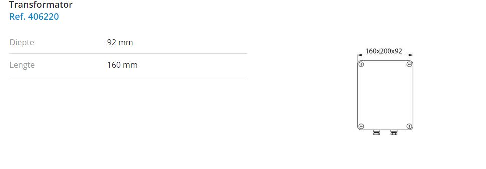 Transformator 230/12 V voor elektrische aansluiting. In waterdichte inbouwkast in grijs PVC (200x160x92mm) met tweepolige schakelaar.