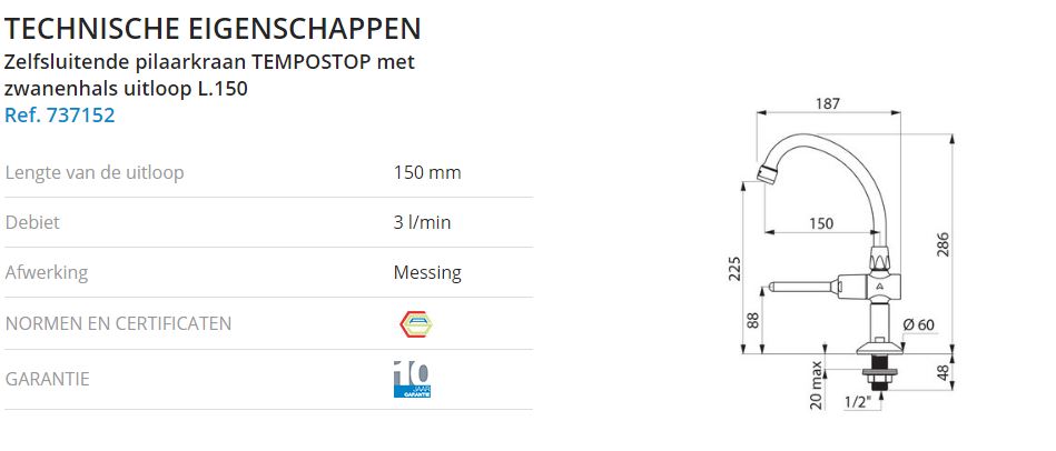 737152 Tempostop zelfsl.pilaar kraan met hendel en gebogen uitloop 150mm/225mm hoog