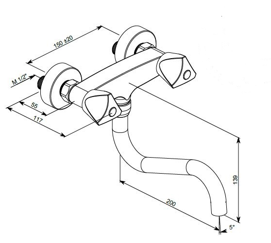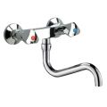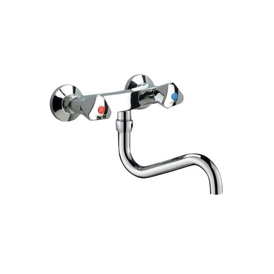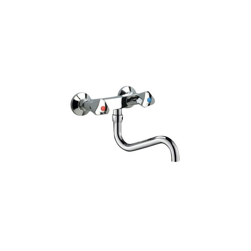 Muurmengkraan voor spoeltafel met draaibare getrokken uitloop L.200. Onderuitloop Ø 22 met stervormige messing straalbreker. Uitloop met gladde binnenkant (beperkt bacteriënhaarden). Draaiknoppen in verchroomd metaal met keramische binnenwerken. Geleverd met 2 S-koppelingen M1/2” M3/4".