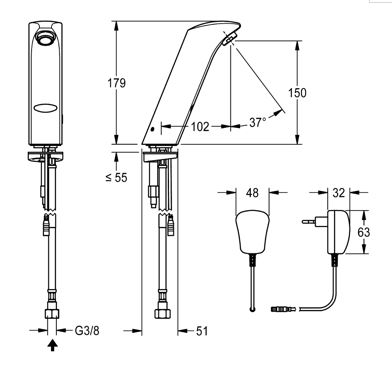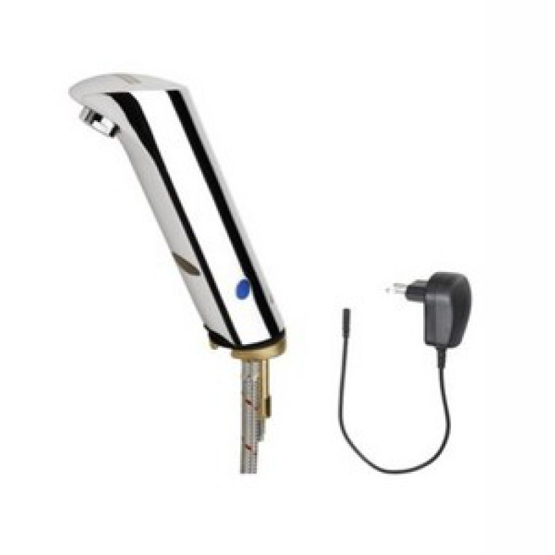 PROTRONIC-S elektronische wastafelkraan DN 15, opto-elektronisch gestuurd, afhankelijk van elektriciteitsnet, geluidsklasse I, met p erlator en geïntegreerde debietregelaar, voor aansluiting op voorgemengd warm en koud water, messing gepolijst verchroomd. Adapter met EU-connector, 230 V AC.