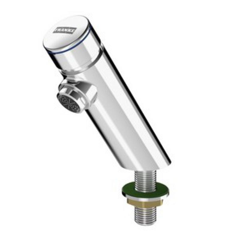 F3S zelfsluitende wastafelkraan DN 15. Zelfsluitende patroon, hydraulisch gestuurd, zuigerloze constructie, automatisch sluitend, stromingstijd traploos instelbaar. Voor aansluiting op voorgemengd warm of koud water. Behuizing messing gepolijst verchroomd. Perlator met geïntegreerde debietregelaar 3,0 l/min. Materiaal messing verchroomd.
