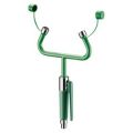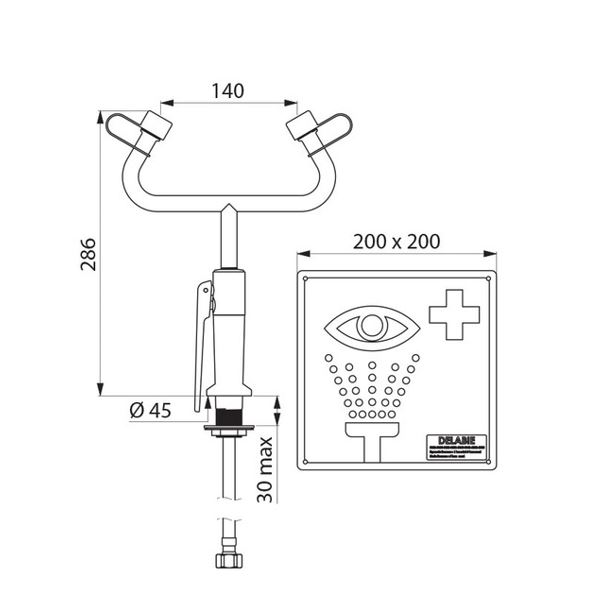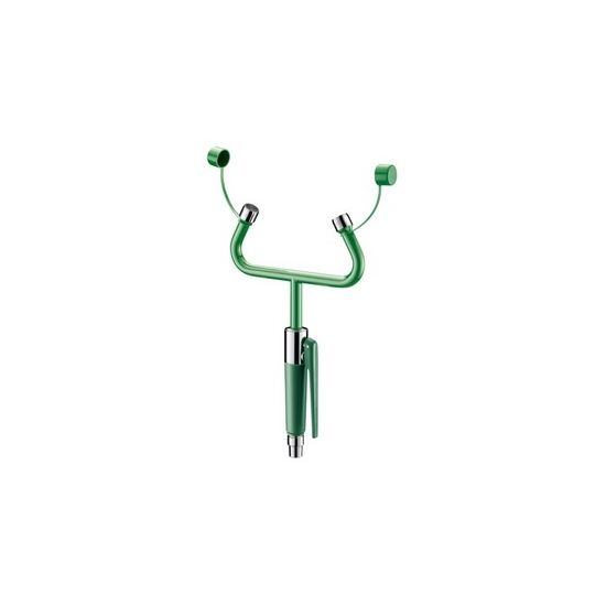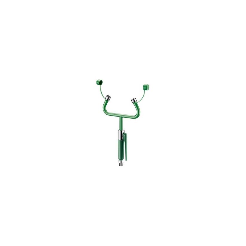 Dubbele sproeier voor oogspoeler, op blad: Op blad met flexibel L.1,50 m 15 x 100 1/2" De sproeikoppen zijn voorzien van beschermdopjes in schokvrij ABS groen die automatisch worden verwijderd door de druk van het water. Zal in werking treden door de hendel in te drukken. Automatische sluiting door veer. Debiet 15 l/min bij 3 bar, beluchters met dubbele RVS filter. Ergonomische greep in groen ABS, hendel in groen polypropyleen. Pictogram "oogspoeler" is voorzien.