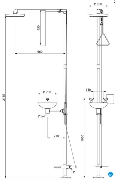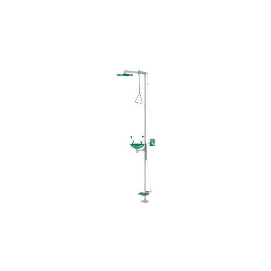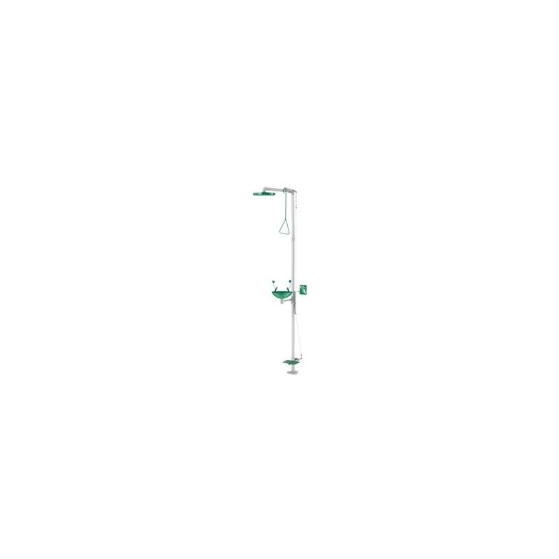 Combinatie nooddouche en oogspoeler op zuil met manuele of voetbediening, omvat: Standaard vorstvrij mechanisme. Waskom Ø 250 mm in RVS AISI 304 groen gelakt. De sproeikoppen van de oogspoeler zijn voorzien van beschermdopjes in schokvrij ABS groendieautomatischwordenverwijderd door de druk van het water. Debiet 20 l/min bij 3 bar, beluchters met dubbele RVS filter. Ronde hoofddouche Ø 250 mm in schokvrij ABS groen. Debiet 90 l/min bij 1 statische bar (140 l/min bij 3 statische bar). Wateraansluiting F1". Gegalvaniseerde leidingen afgewerkt in geëpoxeerd grijs. Het driehoekig handvat is in groen gelaktmessing. Het handplaatje en de pedaal zijn vervaardigd uit groen gelakt gegalvaniseerd staal. Bevestiging op de vloer met plaat in messing (schroeven niet voorzien). Pictogrammen voor "nooddouche" en "oogspoeler" zijn voorzien. Werking: Snelle opening/sluiting met kraan 1/4 slag in vernikkeld messing. Gezamenlijke douche en oogspoeler: Zal in werking treden na het trekken aan de driehoekige greep. De douche stopt niet bij het loslaten van de driehoek. Duw de greep terug op haar plaats om de kraan te sluiten. Enkel oogspoeler: Zal in werking treden door op de pedaal of het handplaatje te duwen. De oogspoeler stopt niet bij he tloslaten van de bediening. Trek aan het handplaatje en duw de pedaal terug omhoog om de kraan te sluiten. De sluiting gebeurt niet automatisch wat toelaat aan de gebruiker de 2 handen vrij te hebben (om de kleding te verwijderen, om de ogen goed open te houden, ...).