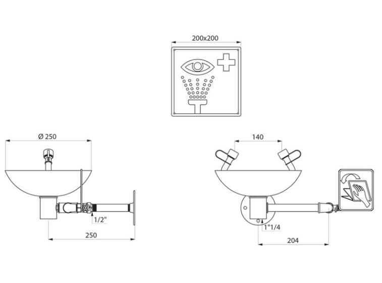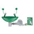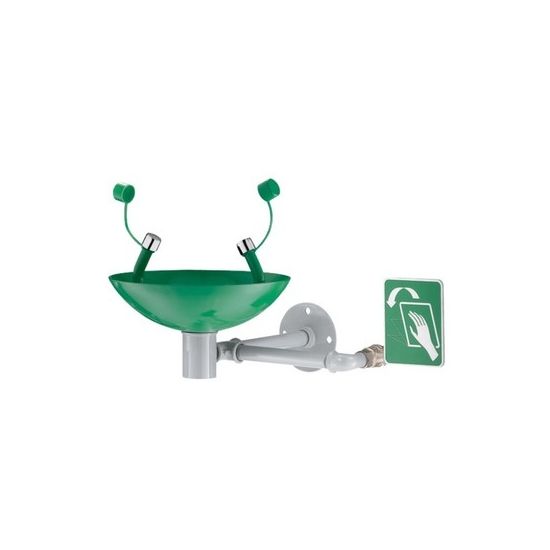 Oogspoeler muurmodel met manuele bediening omvat: Waskom Ø 250 mm in RVS AISI 304 groen gelakt. De sproeikoppen zijn voorzien van beschermdopjes in schokvrij ABS groen die automatisch worden verwijderd door de druk van het water. Snelle opening/sluiting met kraan 1/4 slag in vernikkeld messing. Zal in werking treden door op het handplaatje te duwen. De oogspoeler stopt niet bij het loslaten van de bediening. Trek aan het handplaatje om de kraan te sluiten. Debiet 20 l/min bij 3 bar, beluchters met dubbele RVS filter. Wateraansluiting M1/2’’. Gegalvaniseerde leidingen afgewerkt in geëpoxeerd grijs. handplaatje is vervaardigd uit groen gelakt gegalvaniseerd staal. Bevestiging aan de muur met plaat in messing (schroeven niet voorzien). Pictogram "oogspoeler" is voorzien.