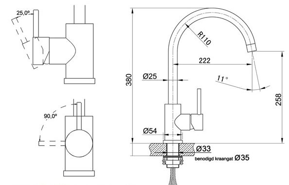 RVS 1-hendel keuken mengkraan hoog met draaibare uitloop keramisch binnenwerk