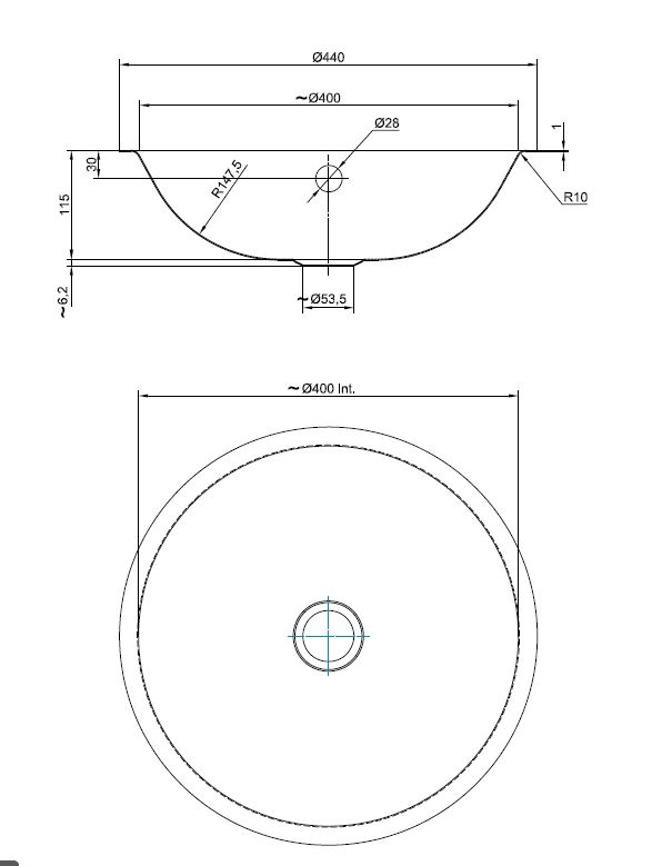 RVS Ronde komwastafel met vlakke rand voor inleg of onderbouw, zonder klemmen. Incl. 1,5" afvoerplug. Met wandoverloop. Inwendig satin finish. Afm. inw. 400mm, diepte 145mm.