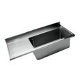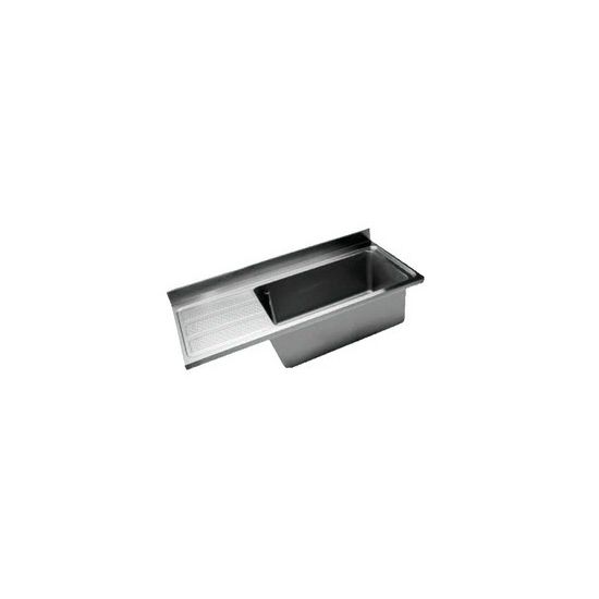 Grote RVS spoelbak met inw. ronde hoeken en waterkering. Voor wandmontage met consoles of montage op onderkast of frame. Blokprofiel aan achterzijde 100mm hoog. Compleet met 1,5" afvoerplug en standpijp. Inw. afm 955x510x380mm. Rechts model.