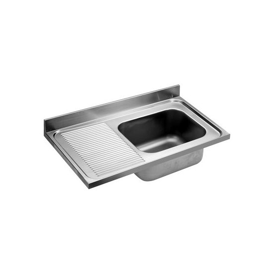 RVS Grootkeuken aanrecht met enkele spoelbak voor wandmontage. Bakmaat 500x500x300mm compleet met 1,5" afvoerplug en standpijp. Achterzijde blokprofiel. Rechts model