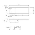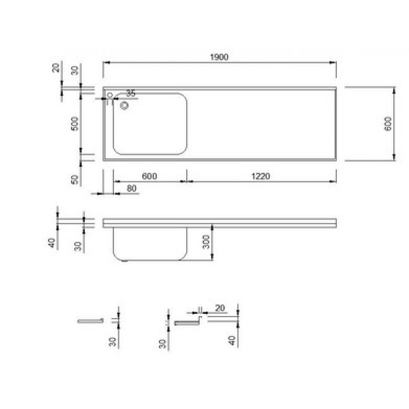 RVS 304 maatwerk aanrecht 1900x600mm met links 1 spoelbak 600x500x300mm. Incl. afvoerplug 1,5" met standpijp. Achterzijde blokprofiel 40/20mm, overige zijden waterkering met rand 30mm. Incl. onderl. 18mm w.v. spaanplaat. Incl. kraangat 35mm op de linkerhoek.