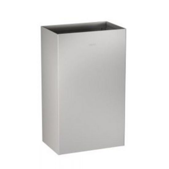 Vuilnisbak voor opbouwmontage, van roestvrij staal, oppervlak zijdemat, materiaaldikte 0,8 mm, afgeronde randen, montage met wandsteun of rechtstreeks op de wand, inclusief roestvrijstalen schroeven en pluggen. Inhoud ca. 23 liter Afmetingen 355 x 460 x 168 mm (B x H x D)