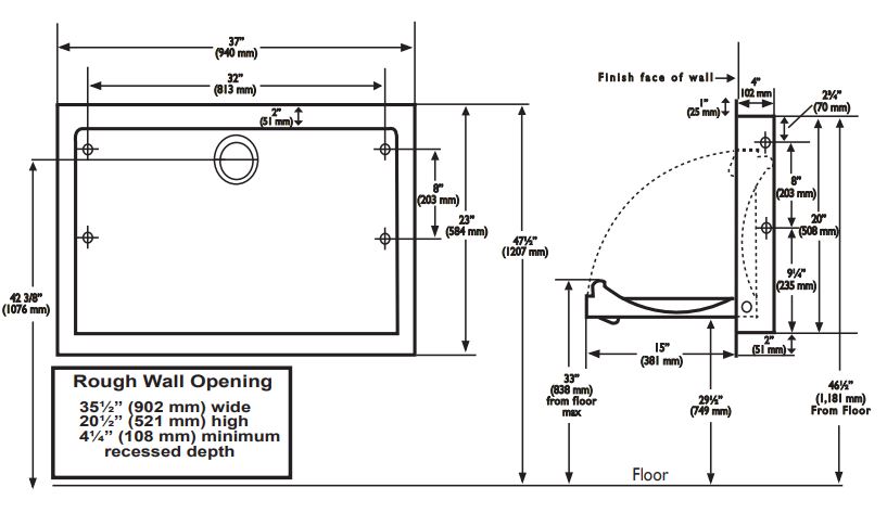 Baby verschoningsunit voor inbouw in de muur. Afm. 940x585x102mm. Opklapbaar.
