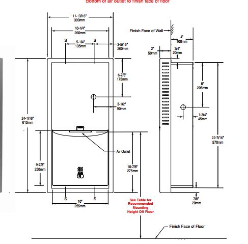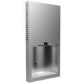 ADA handendroger in satin finish voor inbouw in de muur. Afm. 300mm(b)x610mm(h)x150mm(d), waarvan 100mm in de muur valt. Droogtijd handen 17 seconde. Incl. keramische plaat voor water opvang.