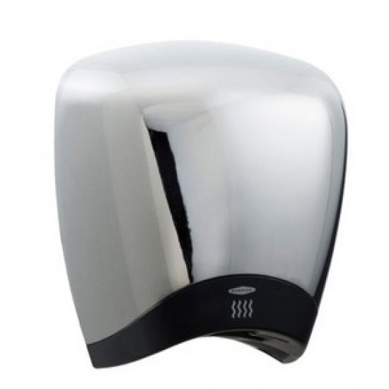 Handendroger van aluminium met chroomkleurige kap. Geschikt voor opbouw aan de muur. Afm. 267mm(b)x307mm(h)x188mm(d).
