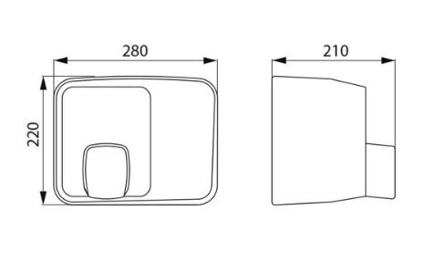 Automatische handendroger.Vandaalbestendig model.Automatische werking d.m.v. optische sensor.360° Richtbare mond.Richtbare mond.Dikte metaal: 1,2 mm.Afwerking kap RVS 304 mat gepolijst.Afmetingen: 210 x 280 x 220 mm.Gewicht: 3,5 kg.Vermogen: 2.000 W. 50-60 Hz.Luchtdebiet: 95 l/s.Beperkt geluidsniveau: 68 dBA.Maximale veiligheid klasse II (dubbele elektrische isolatie), IP23 CE, TÜV GS.Garantie : 3 jaar.