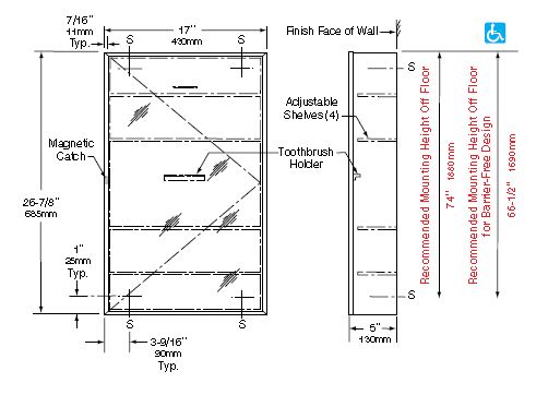 B299 RVS 304 medicijnkast met glazen spiegeldeur. Afm. 432x683x127mm.