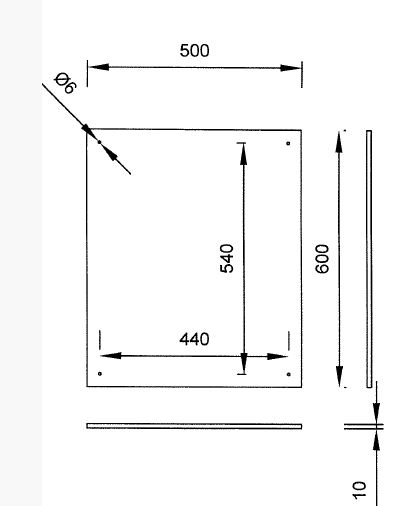 BJ7485060 RVS 304-1mm spiegel 500x600mm randdikte 10mm. Incl. 4 montagegaten (excl. bev.materialen)