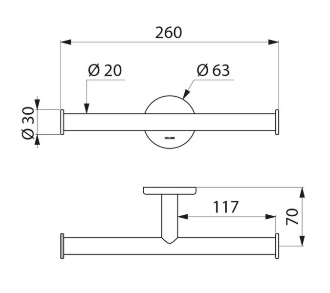 Dubbele toiletpapierrolhouder. Buis Ø 20, dikte 1 mm. RVS 304 glanzend gepolijst. Verborgen bevestigingen.
